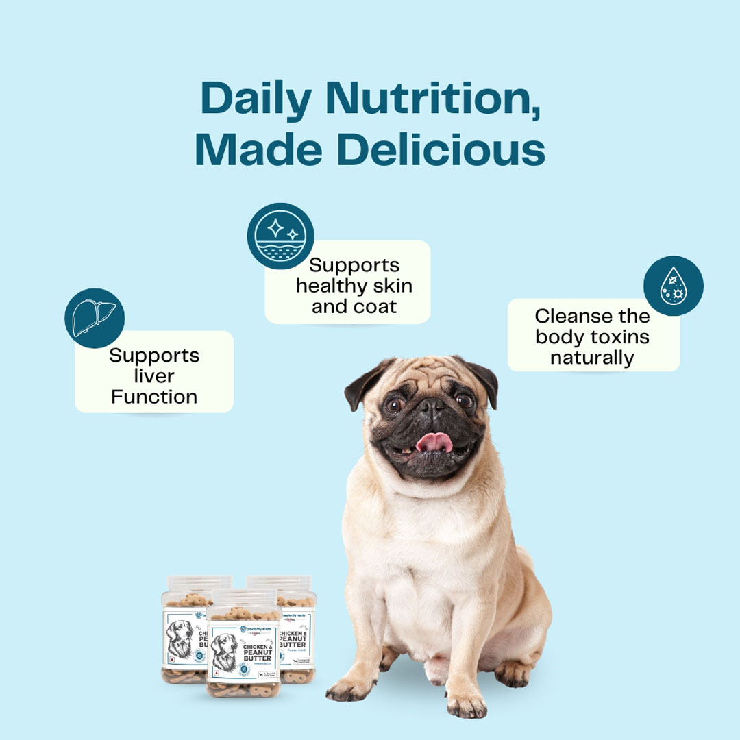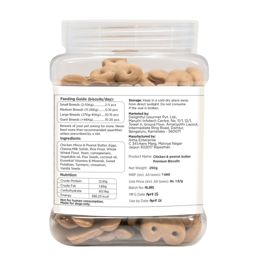 Our biscuits are made with real chicken and natural peanut butter—baked into a crunchy, protein-rich treat that dogs love. No artificial flavors or additives.
