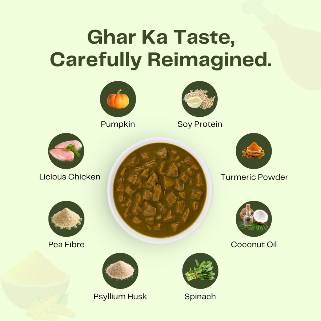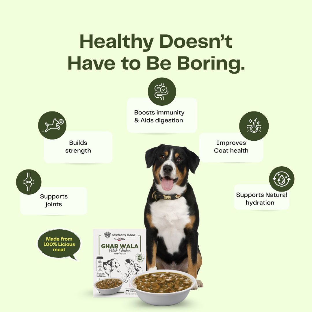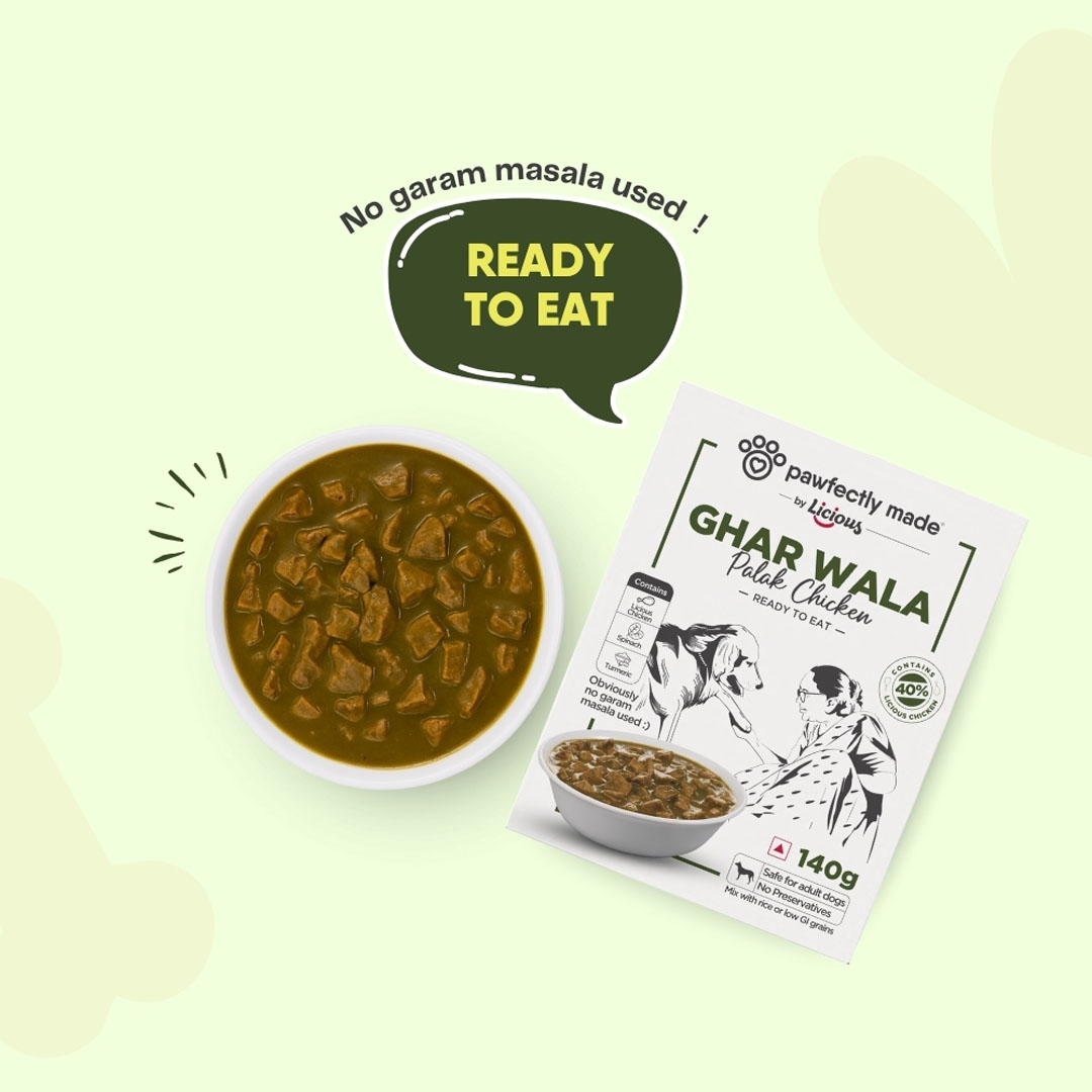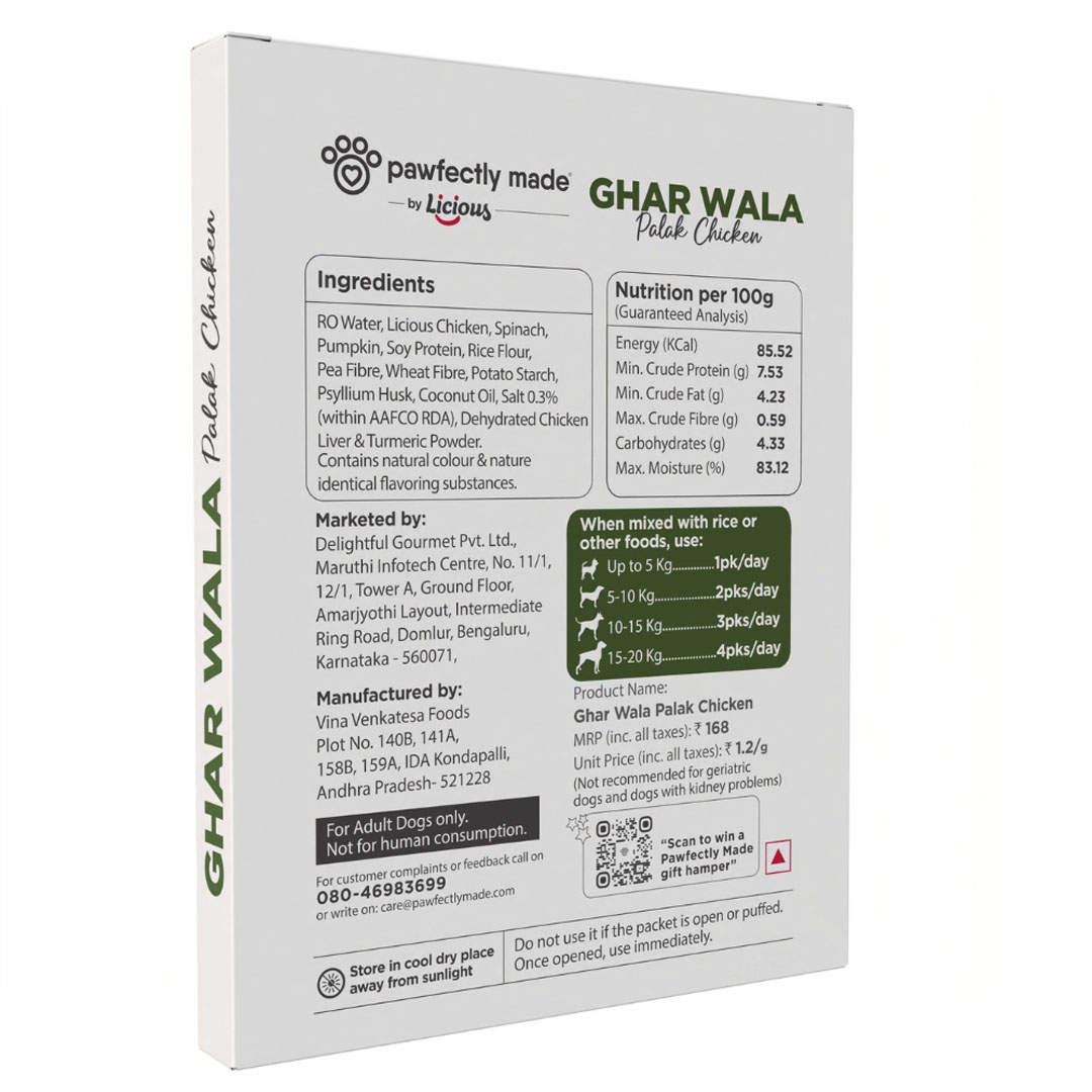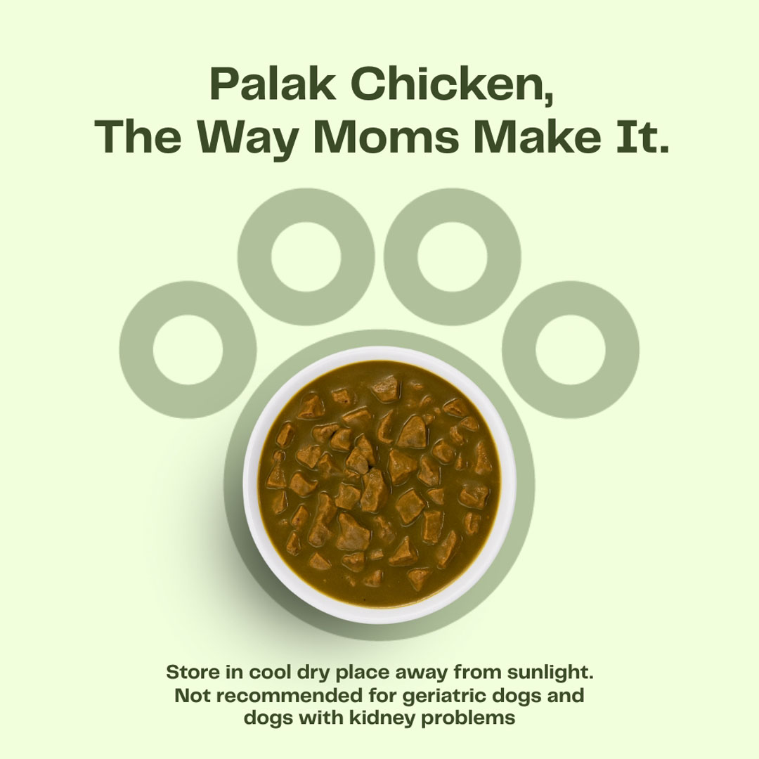 Palak Chicken contains specific nutrient levels and fiber content best suited for fully developed digestive systems. It’s not recommended for puppies under 12 months.