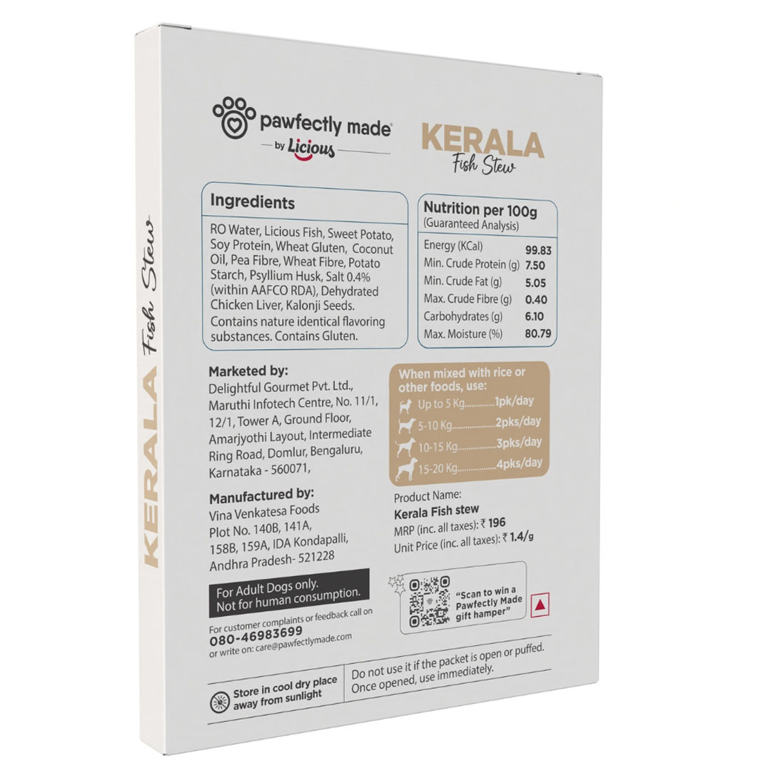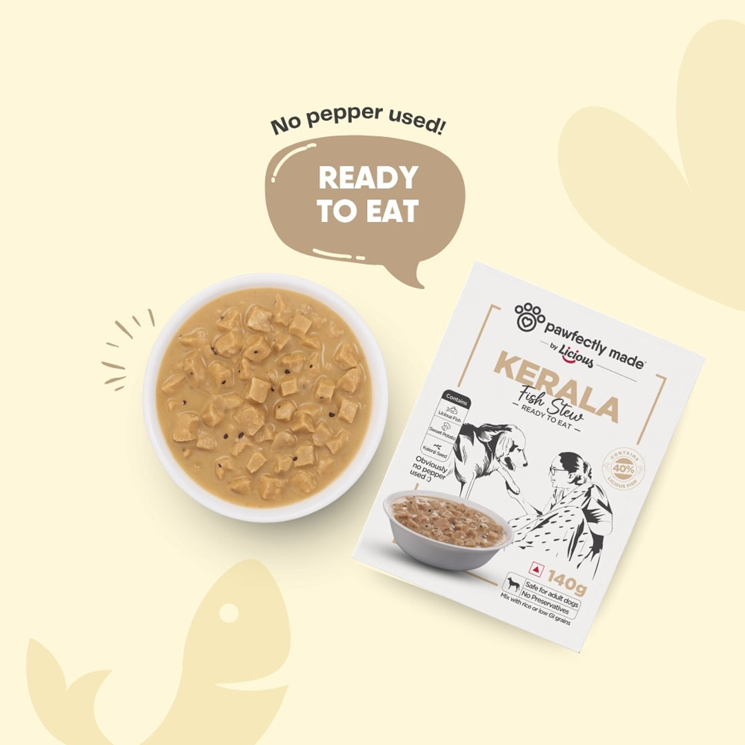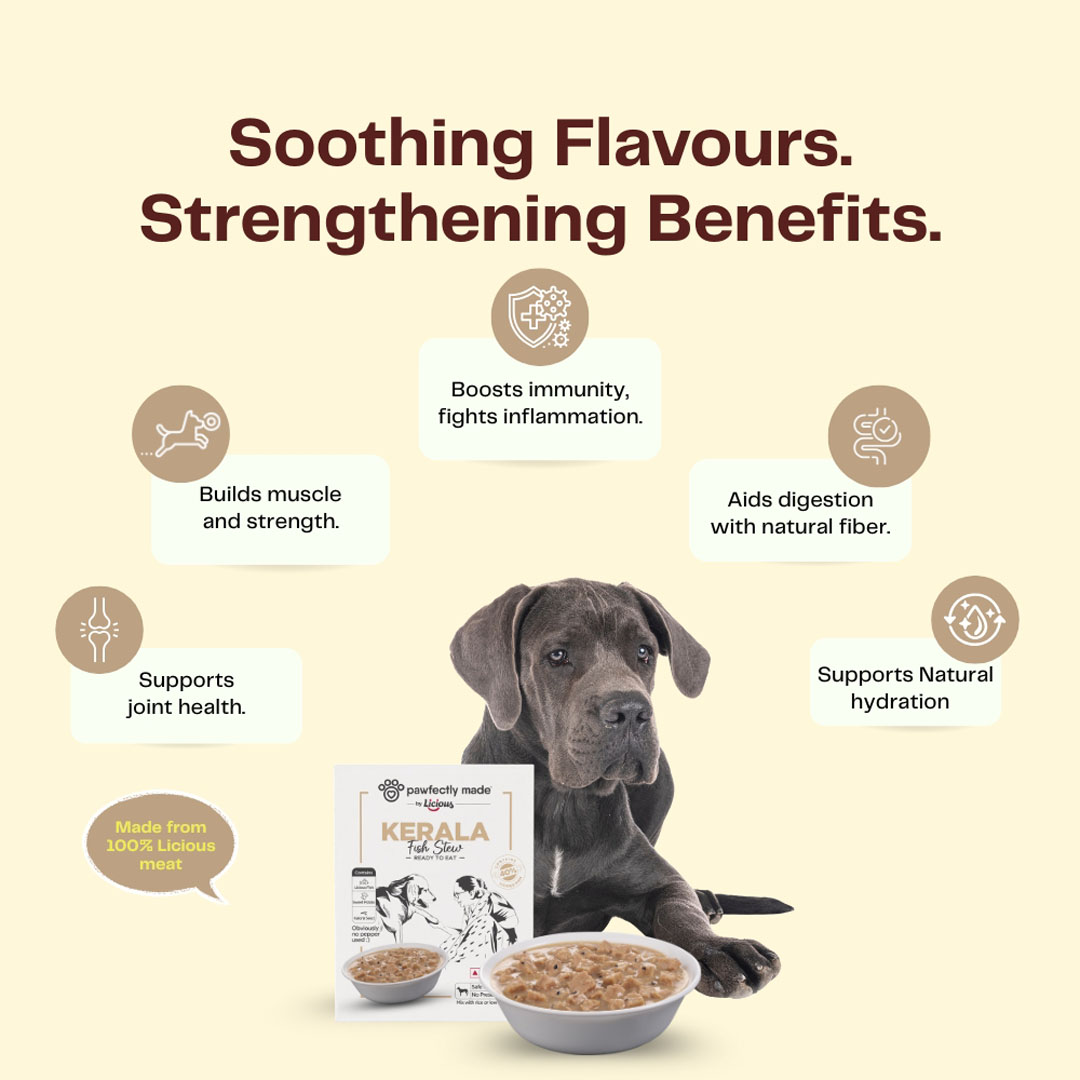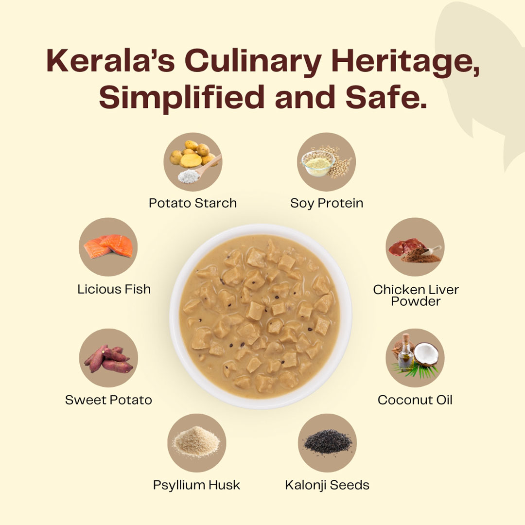 It’s a dog-safe version of the traditional Kerala dish, made with real fish, coconut milk, and gentle, dog-friendly spices—created especially for adult dogs to enjoy rich flavor and balanced nutrition.