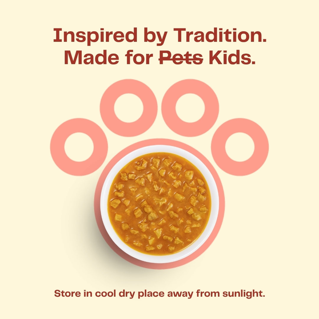 It’s a dog-safe version of the classic dish—made with real chicken and a gentle blend of dog-friendly spices. No onions, garlic, or cream—just rich flavor and wholesome nutrition.