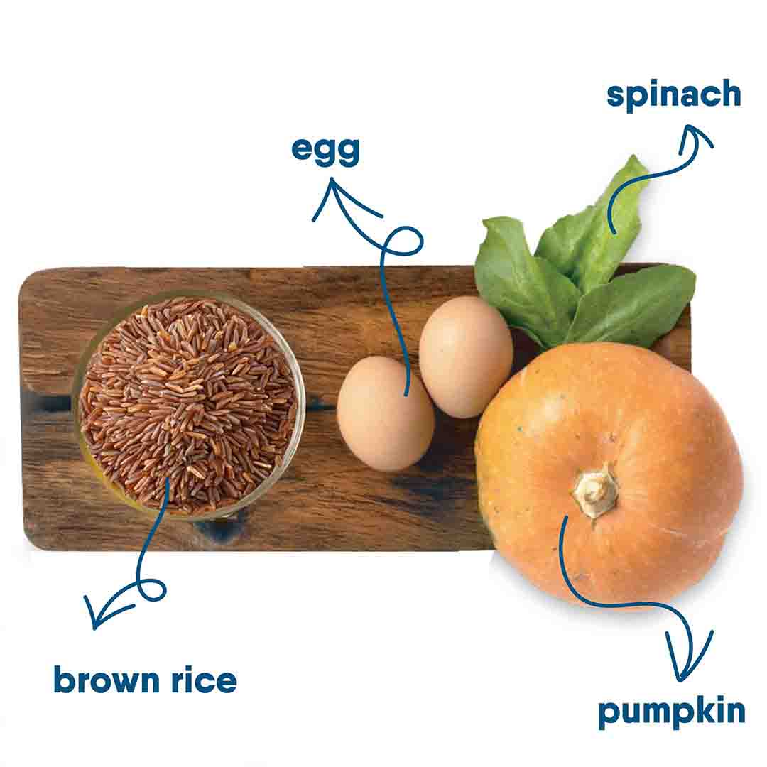 It’s a nourishing meal made with eggs and pumpkin, designed for dogs.